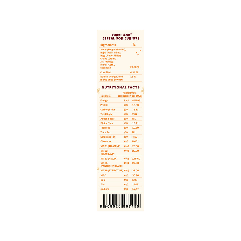 Give your baby the best start with our Puddi Pop– a nutritious, wholesome, and delicious option made from 100% natural ingredients. Free from wheat, sugar, and milk powder, this cereal is carefully crafted to provide your baby with all the essential nutrients without any unnecessary additives.